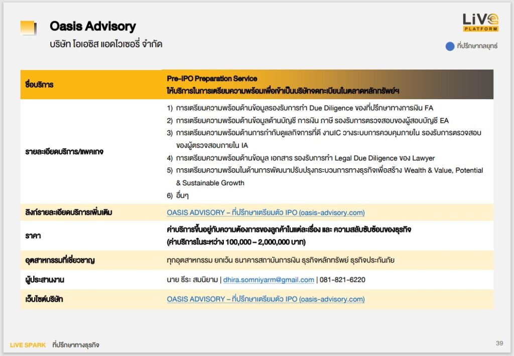 Oasis Advisory เป็นผู้ให้บริการ ด้าน Pre-IPO Preparaion สำหรับบริษัทที่ต้องการเตรียมตัวเข้าเป็นบริษัทจดทะเบียนในตลาดหลักทรัพย์ฯ ติดตามรายละเอียดของการให้บริการ ตามเอกสารแนบ ในหน้า 39